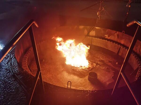 耐火試驗(yàn)標(biāo)準(zhǔn)大幅升級(jí),無(wú)異對(duì)于浮盤的整體性能提出了更高的要求,澳科中意首先選擇自有的Vap-O-Loc全接液復(fù)合材料浮盤進(jìn)行了新標(biāo)準(zhǔn)試點(diǎn),在包括2小時(shí)的密封圈火災(zāi)、中心開孔(模擬浮盤發(fā)生損壞)火災(zāi)、全液面火災(zāi)的3種試驗(yàn)場(chǎng)景中均可保持其漂浮性能和結(jié)構(gòu)完好性,試驗(yàn)過程中浮盤始終能夠完整覆蓋并保護(hù)液面,在完成試驗(yàn)后漂浮能力無(wú)明顯變化,順利通過了所有項(xiàng)目的考驗(yàn)。